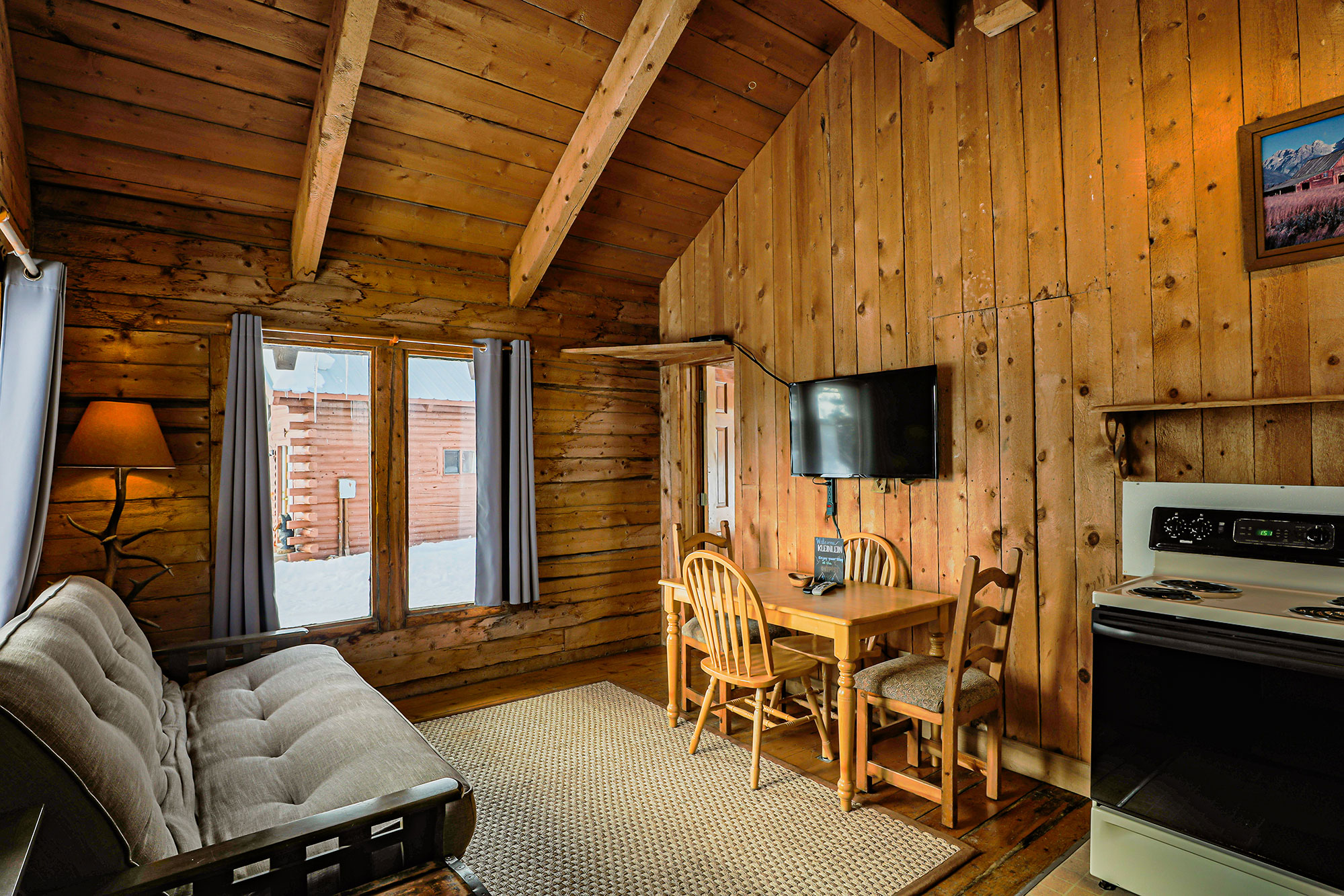 - Open room plan with living area, dining area, furnished mini kitchen, and a pull-out queen size couch